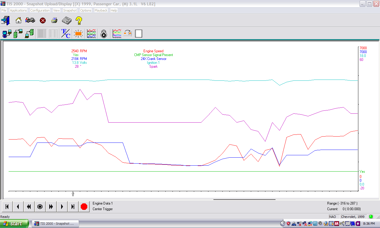Back at the shop I download my snapshot. I choose to look at 5 pids closely. Engine Rpm, Cam Signal, Ignition 1, 24x Crank Sensor, and Spark Timing. This 3100 motor has a 7x Crank Sensor in the block that reads off notches on the crankshaft. This sensor is the engine speed input to the Ignition Control Module. From there the module then conditions this signal and produces what is called Ckt. 430. This is the main rpm input to the PCM for engine speed calculations, ignition timing, fuel injection control, etc. We also have a 24x crank sensor that reads off the front of the crankshaft via windows on crankshaft dampener. This signal is sent directly to the PCM. The PCM uses this signal for low speed timing events. Typically this signal stops being looked at above approximately 1600rpm. Then there is a Camshaft Sensor which is utilized for sequential fuel injection. Every year has different wrinkles for each of these sensors. What I layed out is a generalization. So, if we look at the snapshot above the first thing I see is that 24x is above the usual rpm limit of approximately 1600rpm. It is at 2184 rpm. The other pids look ok. Let's go backwards in the snapshot.